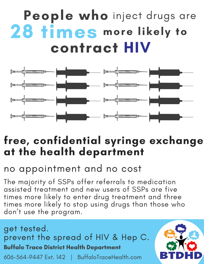 The Buffalo Trace District Health Department offers a syringe access and exchange program (also known as a “syringe exchange”).